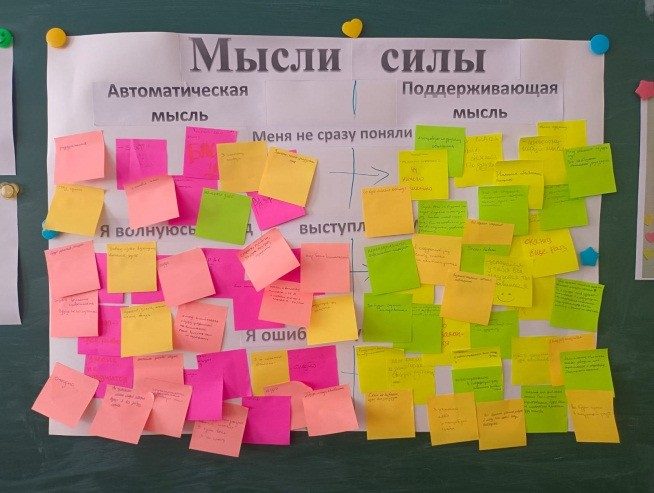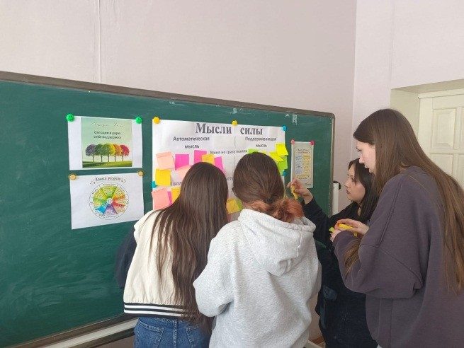 В упражнении «Позитивное мышление» студенты учились замечать автоматические мысли в сложных ситуациях (ошибка, волнение перед выступлением, непонимание) и находить поддерживающие формулировки, позволяющие сохранить внутреннюю устойчивость.