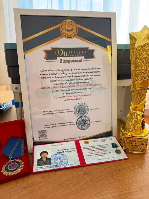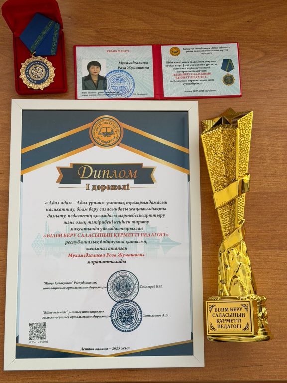 16 желтоқсан Тәуелсіздік күніне орай Мемлекет басшысы Қасым-Жомарт Тоқаевтың "Тәуелсіздік бәрінен қымбат" атты бағдарламалық мақаласын қоғамға кеңінен насихаттау мақсатындағы Елордамызда ұйымдастырылған республикалық форумында жыл үздіктерінің салтанатты марапаттау рәсімі өтті. Қазақстанның түкпір-түкпірінен келген тәжірибелі педагогтер қатысып, олардың арасынан кәсіби шеберлігімен, нәтижелі еңбегімен және үздік тәжірибесімен ерекшеленген ұстаздар іріктелді. Сол үздіктердің қатарынан көрінген география және биология пәндері мұғалімі Мухамедгалиева Роза Жумашовна байқау нәтижесі бойынша жоғары бағаға ие болып, «Адал адам – Адал ұрпақ» ұлттық тұжырымдамасын насихаттау, білім беру саласындағы жаңашылдықты дамыту, педагогтің қоғамдағы мәртебесін арттыру және озық тәжірибені кеңінен тарату мақсатында ұйымдастырылған «БІЛІМ БЕРУ САЛАСЫНЫҢ ҚҰРМЕТТІ ПЕДАГОГІ» республикалық байқауының І дәрежелі дипломы мен төсбелгісіне ие болды. Марапаттау рәсімі Астана қаласындағы «Қазмедиа» орталығында салтанатты деңгейде өтті. Байқау талаптарына сәйкес, қатысушы педагогикалық қызметі барысында жинақтаған жетістіктерін портфолио негізінде ұсынды. Сонымен қатар, ұстаздың жетекшілігімен түрлі деңгейдегі олимпиадалар мен байқауларға қатысып, жүлделі орындарға ие болған оқушылардың жетістіктері де портфолио құрамына енгізілді. Бұл жеңіс – ұстаздың көпжылдық еңбегінің, кәсіби шеберлігінің және жас ұрпақты тәрбиелеу жолындағы адал қызметінің айқын дәлелі деп есептейміз.